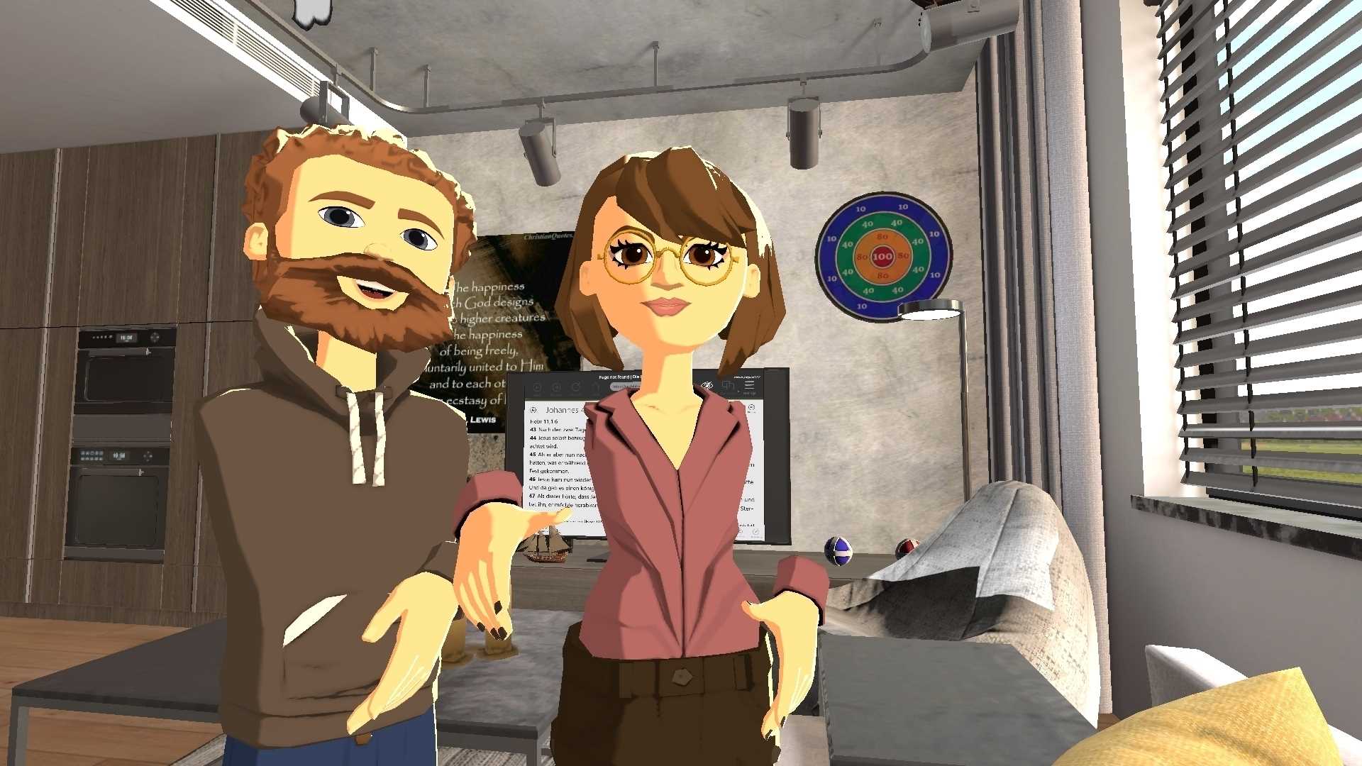 Im Dezember 2021 fingen wir an, darüber nachzudenken, ob es nicht eine Möglichkeit gäbe, trotz der Corona-Kontaktbeschränkungen und ohne viel Fahrerei mit anderen Interessierten die Bibel zu lesen. Zu der Zeit hatten wir ab und zu Zoom-Meetings, die von Mitgliedern unserer Ortsgemeinde organisiert wurden. Allerdings merkten wir schnell, dass man sich oft ins Wort fiel, da man keine Möglichkeit hatte, zu signalisieren, dass jemand anders ruhig zuendesprechen kann, ohne demjenigen wieder ins Wort zu fallen. Parallel entdeckten wir die Möglichkeiten der virtuellen Realität und lernten dabei Enrico kennen, der schon zuvor Erfahrungen mit Predigten in verschiedenen Metaversen machte. Inspiriert von "Andy's Apartment" in AltSpaceVR fand sich dann auch ein gemütliches Domizil dafür. Leider wurde die Platform im März 2023 abgeschaltet, sodass wir gezwungen waren, ein neues Zuhause zu finden. Nachdem wir einige Platformen ausprobiert haben und weder von sprechenden Bananen, beängstigend ausladenden Mundbewegungen noch flimmernden Linien abgelenkt werden wollten, entschieden wir uns erstmal für Horizon Workrooms und nun für Engage.